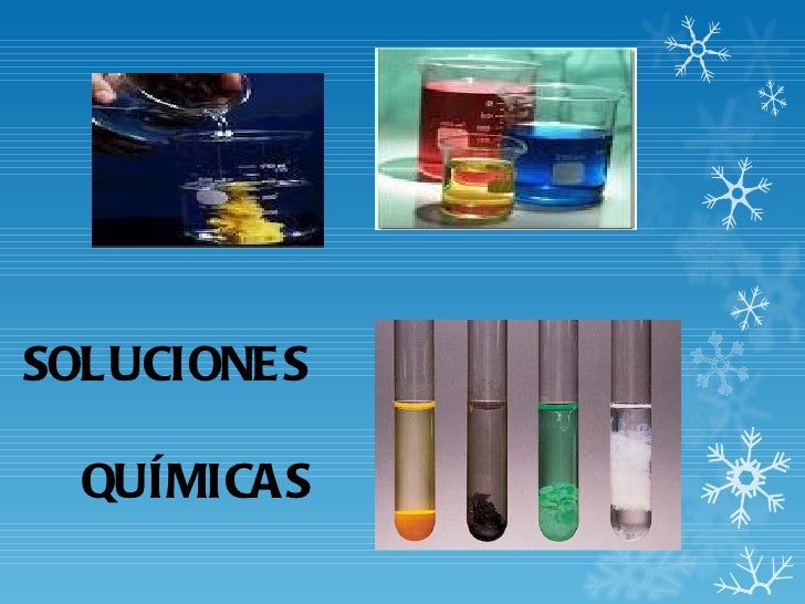 Soluciones. Una solución es una mezcla homogénea a nivel molecular o iónico de dos o más sustancias puras que no reaccionan entre sí, cuyos componentes se encuentran en proporciones variables. También se puede definir como una mezcla homogénea formada por un solvente y por uno o varios solutos. Un ejemplo común podría ser un sólido disuelto en un líquido, como la sal o el azúcar.
