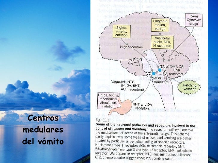 Fisiopatología del vomito. El centro del vómito recibe impulsos provenientes del tubo GI de la corteza cerebral, del aparato vestibular, responsable de la cinetosis, y de la zona quimiorreceptora desencadenante, que se activa por la acción de muchos fármacos y toxinas. Se relaja el fundus gástrico y el esfínter gastro esofágico.