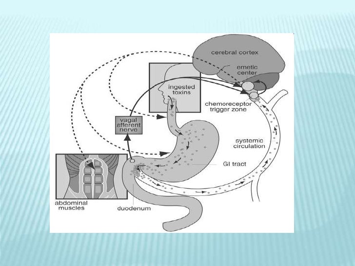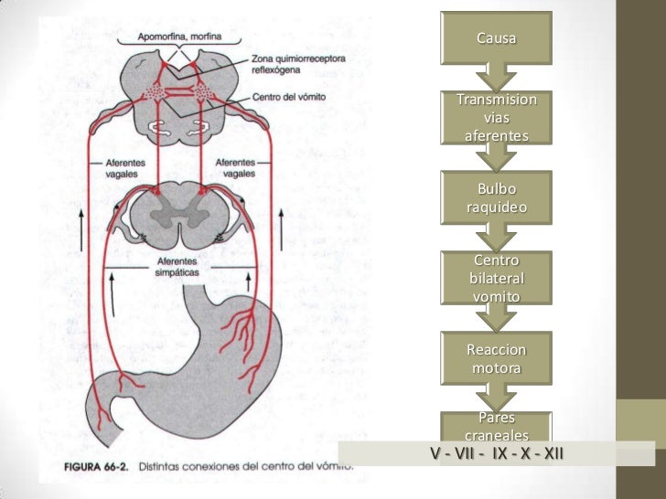 El mecanismo del vómito está regulado por dos centros nerviosos: el centro del vómito (CV) y la zona gatillo quimioreceptora (ZGQ). El CV es el "coordinador" del vómito. Hasta él llegan fibras nerviosas procedentes de todos los lugares capaces de inducirlo. Por supuesto las distintas partes del tubo digestivo, pero también otros.