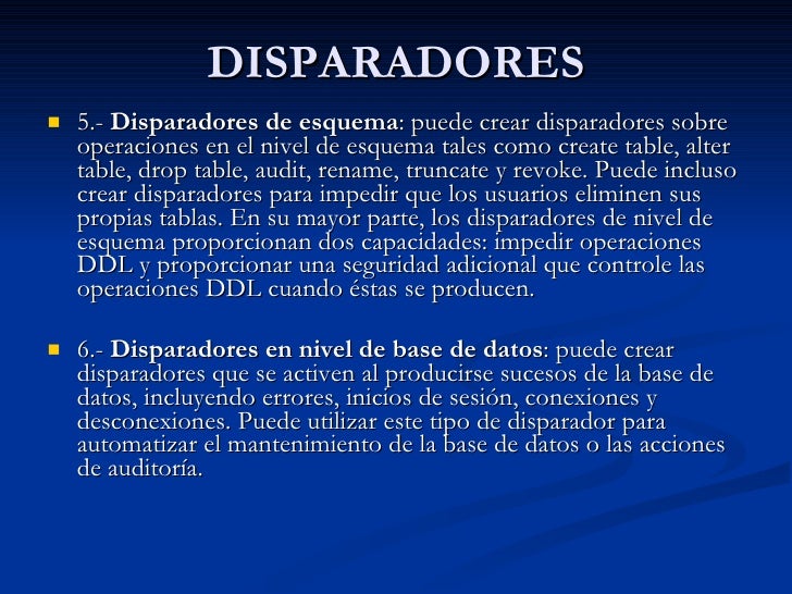 Disparadores en nivel de base de datos: puede crear disparadores que se activen al producirse sucesos de la base de datos, incluyendo errores, inicios de sesión, conexiones y desconexiones. Puede utilizar este tipo de disparador para automatizar el mantenimiento de la base de datos o las. 2- Crear un desencadenador que se active cuando.