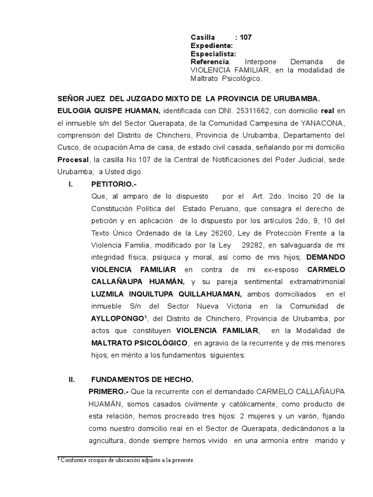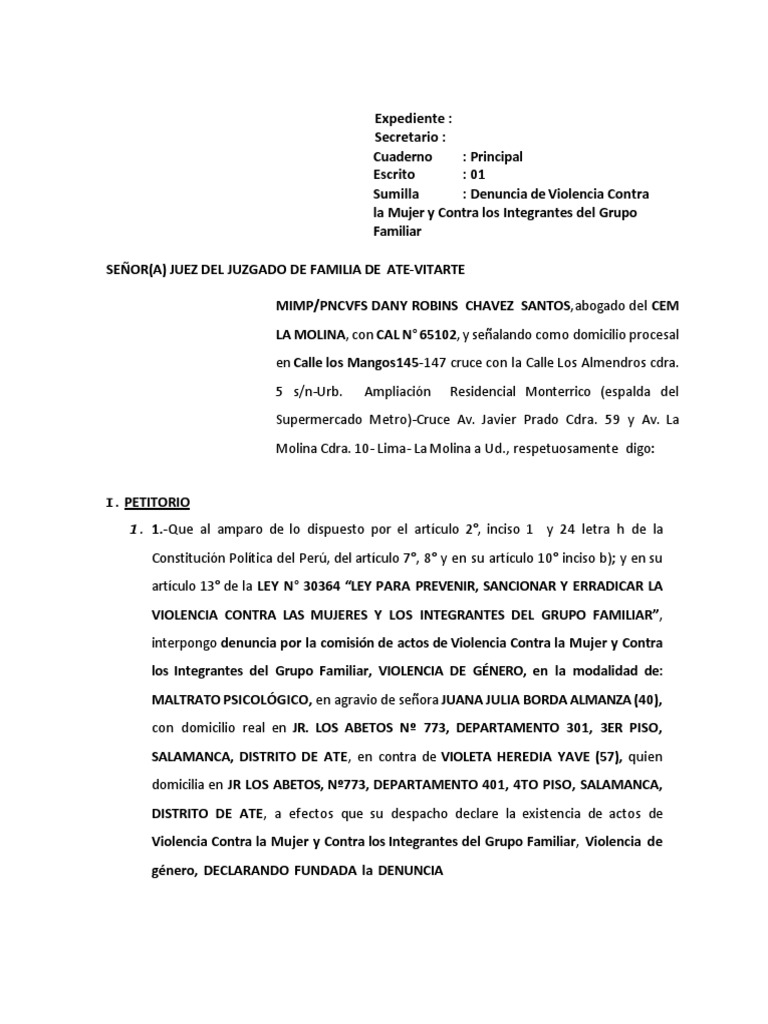 OTROSI 5 .-. Señalamos domicilio procesal en la Av. Juan Pablo II, Nº 1085, zona Ferropetrol de la ciudad de El Alto. Para descargar el Modelo de Memorial de Denuncia de Violencia Familiar COMPLETO en formato WORD haga clic en el siguiente enlace: Descargar Modelo de Memorial de Denuncia de Violencia Familiar Bolivia en WORD.