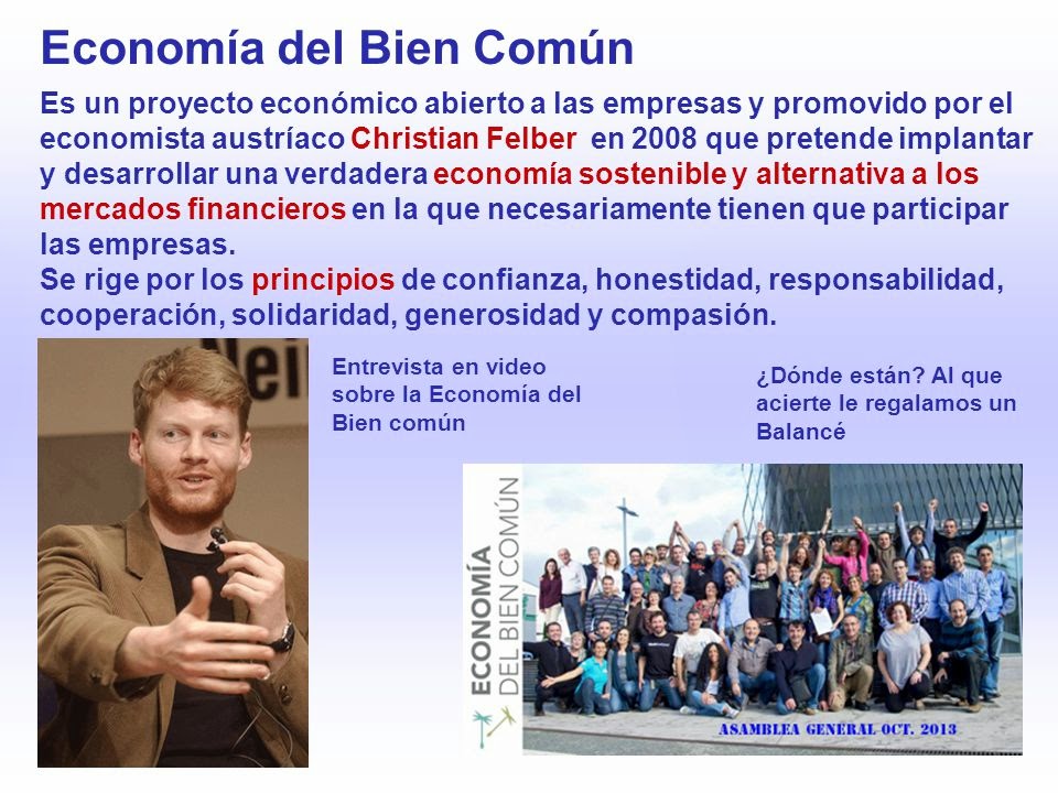 Hay algo que funciona más allá del capitalismo y del comunismo La economía del bien común, el modelo económico alternativo de Christian Felber, ha despertado un enorme interés en todo el mundo.Prueba de ello es que en menos de un año, centenares de ciudadanos, políticos, asociaciones y empresas se han unido a esta iniciativa y no parece que esto vaya a acabar aquí.