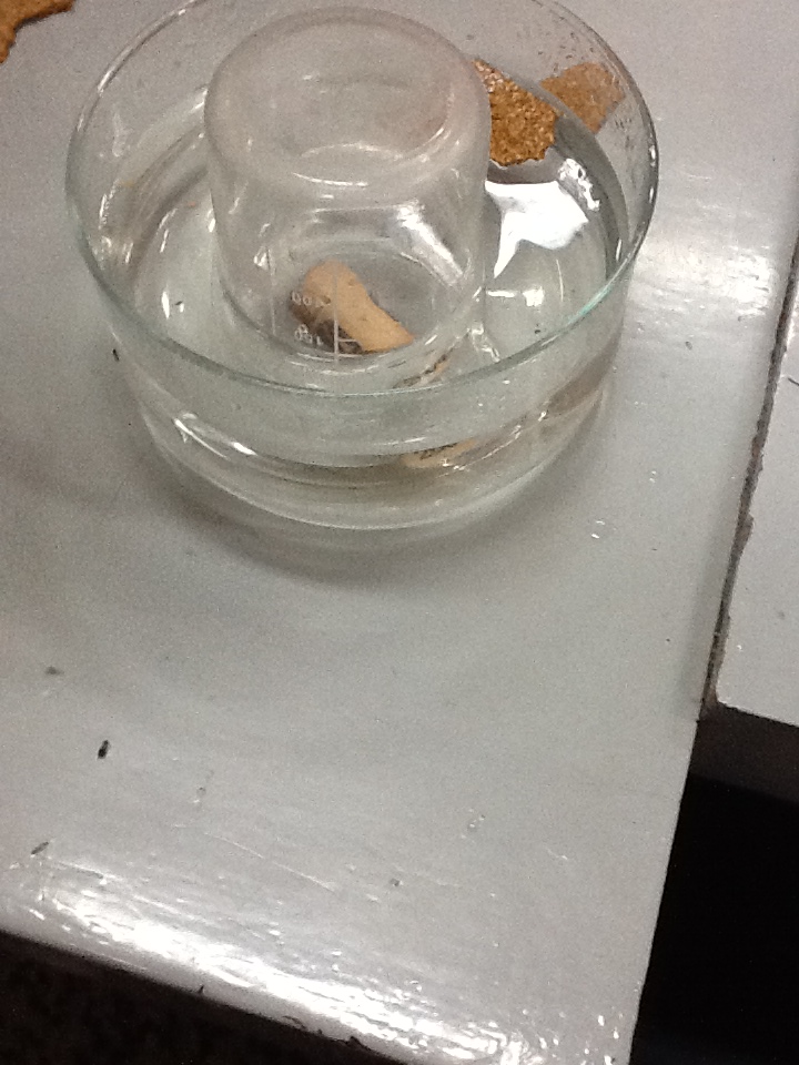 Nosotros utilizamos agua de color, para mayor efecto visual. 3.- Coloca el corcho en el agua, es mejor si flota al centro del plato. 4.- Voltea el vaso, boca abajo, y cubre el corcho con el vaso invertido, sumergiendo verticalmente hasta que toque el fondo del plato. 5.- Observa la nueva posición del corcho y si hay agua adentro del vaso o copa.