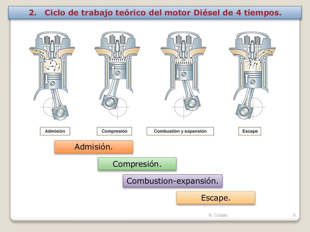 Cómo son los 4 tiempos de un motor diésel. Los motores diésel se componen de cuatro tiempos que se repiten de forma cíclica para generar la energía necesaria para su funcionamiento. Estos cuatro tiempos son: admisión, compresión, combustión y escape. Admisión: En este primer tiempo, el pistón desciende y se abre la válvula de.