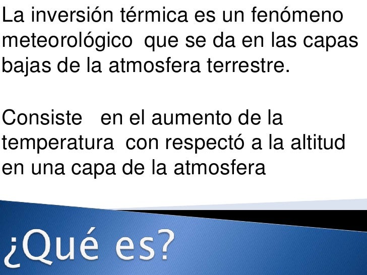 Causas y efectos. Una inversión térmica es cuando las temperaturas ascienden en vez de descender con altura. Dependiendo de cuándo y cómo ocurra, puede ocasionar: tormentas, neblinas, un poco de frío o mucho calor y hasta altos niveles de contaminación, afectando nuestra salud. ¿QUÉ ES LA INVERSIÓN TÉRMICA Y CÓMO SE PRODUCE?