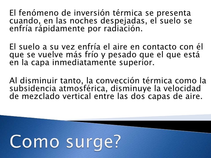 Un fenómeno natural que tiene que ver con diferencias de temperatura y la manera en que se distribuye en la superficie, es la inversión térmica.Aunque esta en sí no provoca efectos en la salud, lo que causa daño, dicen los especialistas en ciencias de la atmósfera, es la acumulación de contaminantes dentro de la capa de inversión.. La inversión térmica es un tipo de característica.