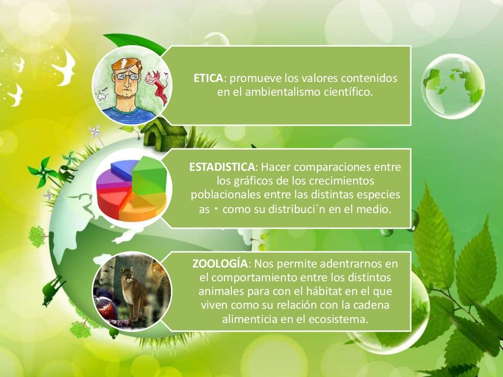 La ciencia de la ecología está presente en muchas otras materias de las ciencias naturales por ejemplo la botánica y el estudio de los animales la ecología es una de las ciencias que se deriva de todas estas ciencias naturales y estela que incentiva a las personas a conservar los medios naturales que tenemos como alimentación y como.