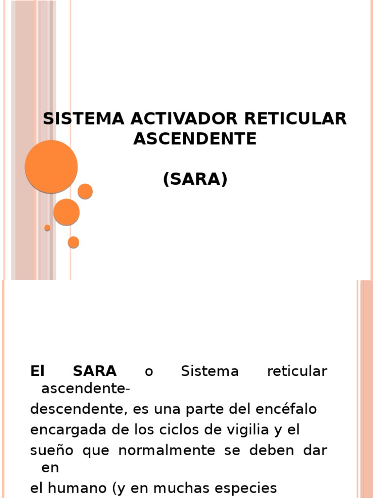 Habla sobre el Sistema reticular activador ascendente (SARA) que se encuentra en el tallo encefálico siendo un rastreador del cerebro. "Nos acerca a nuestras.