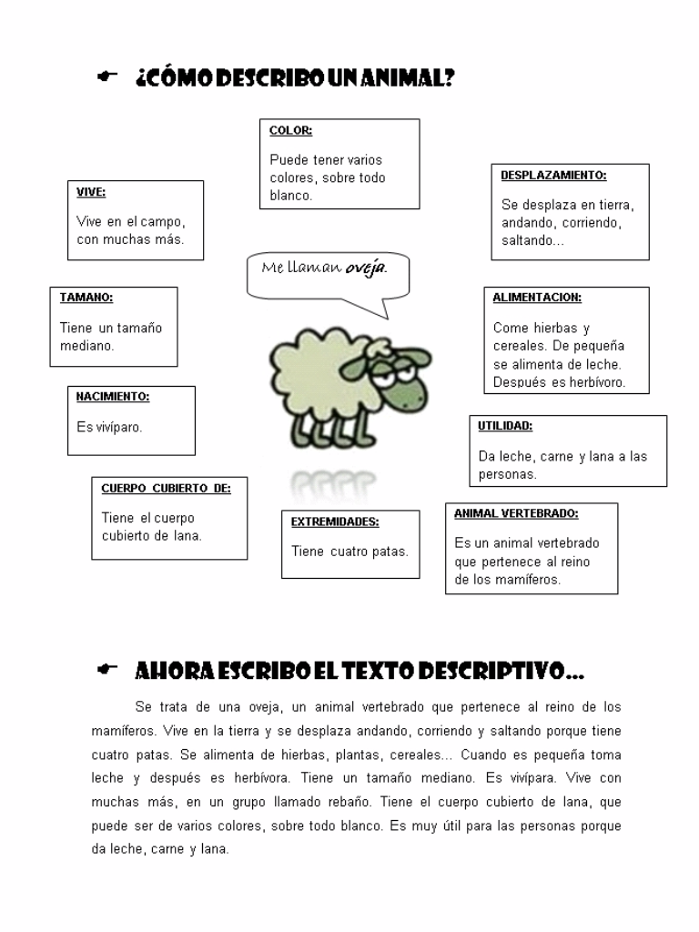DESCRIPCIÓN DE UN ANIMAL (2º primaria) 1) Escritura libre. Proponemos a los alumnos que escojan su animal favorito y hagan una redacción con. un texto modelo, el cual dejaremos a la vista en todo momento. Importante recordarles que antes de entregar el escrito hay que revisar lo que han escrito (sentido, repeticiones, faltas, puntos.